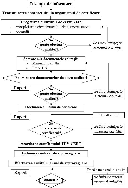 Pentru exemplificare se va analiza modalitatea certificarii sistemelor calitatii de catre organizatia T V-CERT al TV Rheinland InterCert (Germania). De asemenea se vor prezenta, in continuare, si cateva consideratii care au determinat aceasta alegere.