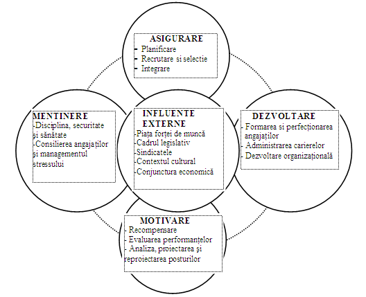 In centrul schemei se afla influentele externe: cadrul legislativ, piata fortei de munca, sindicatele, contextul cultural (inclusiv filozofia si practicile manageriale), conjunctura economica, care au un impact important asupra mana-gementului resurselor umane. Cercurile din exterior reprezinta fluxul principalelor activitati incluse in managementul resurselor umane, care este un proces continuu.