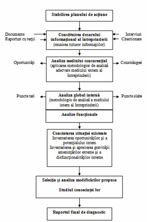 Se observa asadar ca, dupa constituirea dosarului cu informatii privind intreprinderea (dosar care cuprinde rezultatul punerii in practica a diverselor tehnici de diagnostic: inspectia la fata locului, examinarea documentatiei existente, interviurile cu principalii responsabili ai intreprinderii, chestionarele, listele de control, tablourile de sinteza, relatiile cu tertii) intervine activitatea de analiza propriu-zisa. Aceasta se poate axa atat pe mediul concurential al intreprinderii cat si pe mediul intern al acesteia.