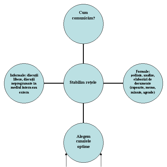In primul rand, stabilim retele de comunicare corespunzatoare atat formale, cat si informale; "desenarea" retelelor formale depinde de specificul domeniului de activitate si de tipul de cultura comunicationala promovat.