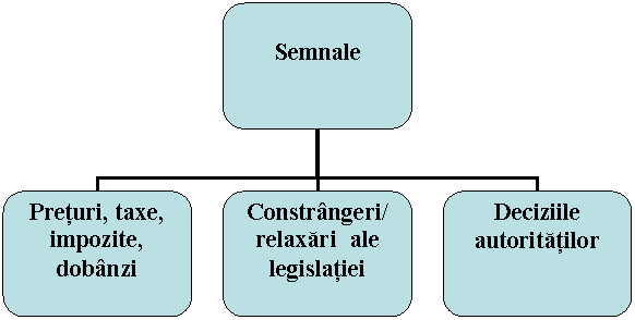 Preturi, impozite, taxe, dobanzi, constrangeri sau relaxari ale legislatiei economice, dar si deciziile autoritatilor sunt surse posibile de semnale pentru toti indivizii, dar in primul rand pentru producatori, investitori, exportatori, importatori, brokeri, bancheri, etc - vezi Fig. 3.10.