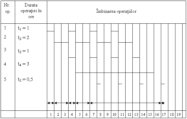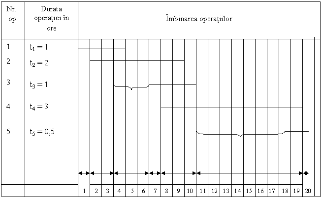 Pentru reprezentarea grafica a acestui tip de imbinare si pentru determinarea pe cale grafica si analitica a duratei timpului tehnologic se considera un lot format din patru produse care necesita un proces tehnologic cu cinci operatii ale caror durate sunt urmatoarele : t1 = 1 ora ; t2 = 2 ore ; t3 = 1 ora ; t4 = 3 ore ; t5 = 0,5 ore .