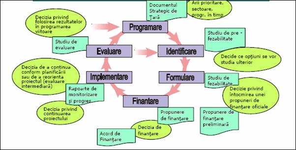 Proiectele se realizeaza intr-o succesiune de etape, pornind de la un document strategic de dezvoltare din care se desprinde ideea de proiect intr-un anumit domeniu (de ex. resurse umane, infrastructura, mediu, turism etc.), care apoi este formulata, implementata si in final evaluata, cu scopul de a crea conditiile necesare pentru realizarea unor actiuni viitoare de dezvoltare.