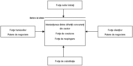 Grafic, cele cinci forte concurentiale care determina capacitatea unei firme de a obtine intr-un anumit sector o rentabilitate superioara costului capitalului sunt prezentate in figura de mai jos.