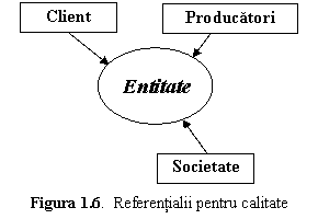 Despre orice produs se spune ca are o anumita calitate aceasta fiind, conform definitiei ISO, o imagine a unei entitati data de caracteristicile calitative. Caracteristicile sunt, de regula, stabilite luand in considerare interesele clientilor si producatorilor. Astfel, ele descriu competitivitatea pe piata. Standardele ISO, dupa 1990, au introdus un al treilea referential in definirea calitatii si anume societatea in ansamblul sau, care reglementeaza piata si concurenta, figura 1.6.