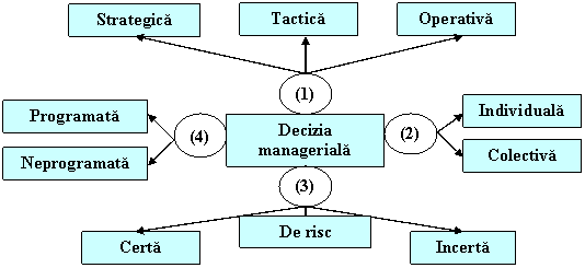 Multitudinea factorilor interni si externi care actioneaza asupra sistemului institutiei/firmei in procesul decizional conduc la diversificarea problematicii scop-mijloace privind adoptarea deciziei manageriale. Situatiile conjuncturale sun tratate in mod diferentiat pe baza unor criterii generale aplicabile in toate institutiile si firmele. Pentru fiecare criteriu de ordonare a diversitatii deciziilor sunt posibile abordari teoretice si practice privind optimizarea solutiilor de actiune in cadrul procesului managerial. In figura 1 se pot evidentia patru criterii de clasificare: (1) orizontul de timp al valabilitatii deciziei, (2) numarul de participanti la adoptarea deciziei, (3) riscul de atingere a obiectivelor deciziei si (4) gradul de structurare al deciziei.