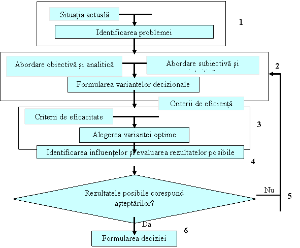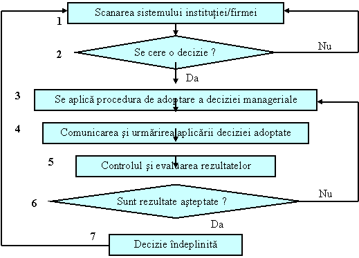 si creste gradul de optimizare in solutionarea problemelor decizionale. In acest stadiu al procesului se estimeaza toate posibilitatile aparitiei unor situatii incompatibile in desfasurarea procesului managerial si in relatiile sistemului institutiei/firmei cu mediul. In etapa a doua se constata daca este sau nu este necesara adoptare deciziei manageriale. Daca se cere a fi adoptata o decizie manageriala, in etapa a treia se aplica procedura de adoptare a acesteia, conform prevederilor metodelor de management practicate in sistem, iar in etapele a patra si a cincia se comunica, se urmareste aplicarea, se controleaza si se evalueaza rezultatele deciziei manageriale adoptate. Daca rezultatele sunt corespunzatoare obiectivelor urmarite se considera decizia indeplinita iar caz contrar, procesul se reia, in rutina de la etapa a treia, pana cand se ating obiectivele urmarite.