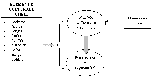 Din perspectiva macro, conform cu Samuel Huntington, popoarele se definesc pe ele insele in termeni de vechime, religie, limba, istorie, valori, obiceiuri si institutii; asociat popoarelor avem cel mai frecvent grupurile etnice, comunitatile religioase si natiunile; reflectarea cea mai ampla o regasim insa sub notiunea de CIVILIZATII. Elementele culturale cheie ce definesc o civilizatie au fost istoria, vechimea, religia, limba, traditiile, valorile si obiceiurile, relatiile de sange, relatiile politice, comerciale si de alta natura etc. "Istoria umana este istoria civilizatiilor", dar in perioada contemporana statul pierde din puterea / atributiile clasice, desi statele raman actori principali in afacerile internationale. Putem concluziona spunand ca acele elemente culturale esentiale/cheie ce definesc o civilizatie se reflecta direct in modul cum inteleg si actioneaza indivizii in cadrul organizational: adica, ei au un anumit comportament in managementul si munca zilnica din organizatiile de afaceri unde lucreaza; asadar, sesizam o conexiune puternica intre realitatile culturale la nivel macro si ceea ce se intampla zilnic in viata organizatiilor, aspect sugerat grafic astfel:
