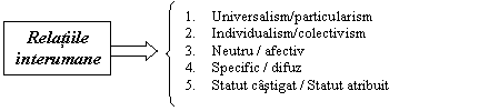 F. Trompenaars considera ca cele trei aspecte sunt probleme universale la care grupurile/colectivitatile dau solutii diferite. Autorul invocat ajunge sa identifice sapte dimensiuni culturale distincte asociate diverselor ways of solving pentru a solutiona problemele universale cu care se confrunta zilnic indivizii in diverse contexte; cea mai complexa problema este cea care tine de relatiile interumane; ea genereaza singura cinci dimensiuni culturale: