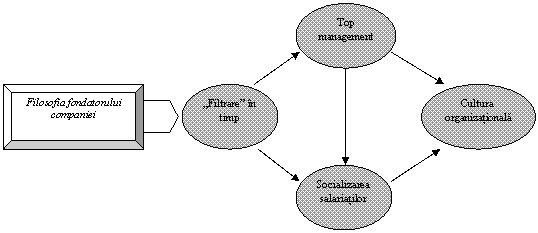 Unii analisti considera ca sursa primara ("radacina") a culturii unei organizatii de afaceri este data de filosofia fondatorului companiei; ulterior, pe parcursul deceniilor, anumite contexte concrete prin care va trece compania vor filtra/selecta valorile majore la care se raporteaza ea ca un tot unitar; in fine, anumite practici aplicate de top-management si socializarea curenta intre salariatii organizatiei, se constituie pe parcursul timpului in surse de formare a culturii organizationale, asa cum sugeram in figura nr.4.