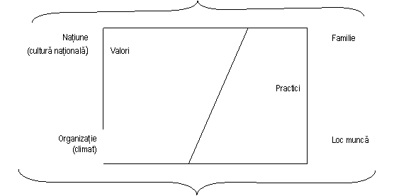Asadar, cultura organizationala se constituie preponderent din practicile acumulate treptat de salariati si mai putin din valori (individual si-a format deja valorile intre 0-9 ani, in copilarie); intr-o schema grafica, avem: