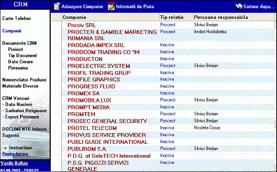 Accesand lista firmelor (Figura 2) operatorul vede rapid tipul relatiei cu firma si persoana responsabila din organizatie.