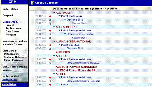 Pentru a anumita firma se poate vedea toata succesiunea de documente ale relatiei cu firma respectiva, oferte, raspunsuri, reveniri, etc.(Figura 3).