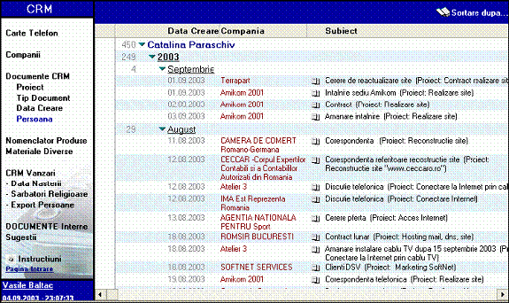 Un anumit vanzator isi poate urmari relatia cu toate firmele cu care lucreaza si istoria contactelor (Figura 5). Desigur ca aceasta informatie este disponibila si managementului, prin CRM se poate urmari astfel nu numai relatia cu clientii, dar si activitatea individuala a unor persoane din firma.