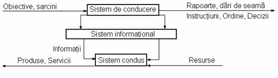 Sistemul informational asigura legatura permanenta si necesara intre sistemul de conducere si sistemul condus in dublu sens: prin preluarea si transmiterea deciziilor de la sistemul de conducere catre sistemul condus si prin inregistrarea, prelucrarea si transmiterea informatiilor privind starea si dinamica sistemului condus, de la acesta, catre sistemul de conducere, asa cum rezulta din figura urmatoare: