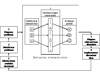 Conform teoriei rationalitatii limitate pasii procesului decizional sunt: