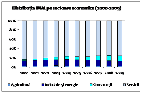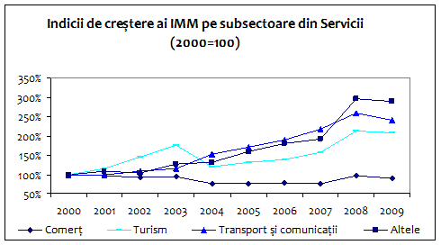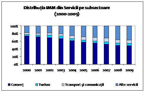 Datele prezentate scot in evidenta faptul ca IMM din Servicii desi urmeaza o tendinta oscilatorie, ajung sa detina pe intregul interval mai mult de jumatate din locurile de munca pana la 57,0% in anul 2009. In schimb, trebuie mentionat si faptul ca 47,9% dintre acestia lucreaza in subsectorul Comert din sfera serviciilor.