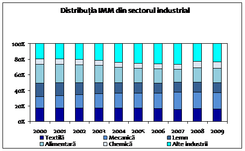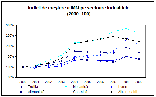 Cu toate aspectele de dinamica negativa inregistrate in anul 2009 in raport cu 2008, situatia nu se deterioreaza in raport cu anul Mai mult decat atat, privit din perspectiva pe cei 10 ani luati in analiza, se poate desprinde fara echivoc concluzia ca exista o tendinta certa de consolidare a sectorului IMM industrial, sustinuta mai ales de rolul sporit al IMM in cadrul industriei mecanice, echipament de transport, echipament electric si optic care castiga teren intr-o dinamica alerta fapt sustinut prin indicii de crestere a numarului de IMM, care evidentiaza dinamica accentuata a numarului de IMM in sub-sectorul industriei prelucrarilor mecanice. Caracteristica este una cu atat mai importanta, cu cat acest sector reprezinta unul cu valoare adaugata mai mare si, implicit, se poate reflecta in sporirea gradului de competitivitate a IMM-urilor romanesti pe piata interna a UE, precum si pe pietele non-UE. De asemnea, din perspectiva Strategiei 2020 adoptate la nivelul UE, IMMurile din subramuri precum constructia de masini si aparatura, de echipamente specializati vor juca un rol important in dezvoltarea intregului sistem economic, in transferul progresului tehnologic si promovarea inovarii la nivelul UE.