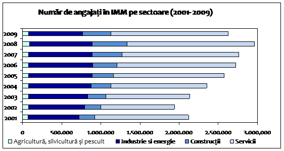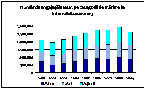 In conformitate cu datele din bilant, la sfarsitul anului 2009 numarul mediu anual de salariati in sectorul IMM era de 2,63 milioane de persoane fata de 2,96 milioane in anul 2008, ceea ce inseamna pierderea a 333.273 locuri de munca. Mai mult decat atat, evolutia indicatorului pe un interval de 10 ani arata ca numarul mediu anual de angajati inregistreaza cu un indice de dinamica negativa de -5% in raport cu anul 2007. Aceasta dinamica negativa accentuata conduce la o scadere a numarului mediu anual de angajati in sectorul IMM sub cel inregistrat la sfarsitul anului 2006 (-3,8% in raport cu anul 2006), in comparatie cu situatia demografica de ansamblu, ilustrata prin evolutia numarului total de IMM care la sfarsitul anului 2009 desi pe o tendinta de scadere se mentine totusi superioara celei inregistrate in anul 2006.