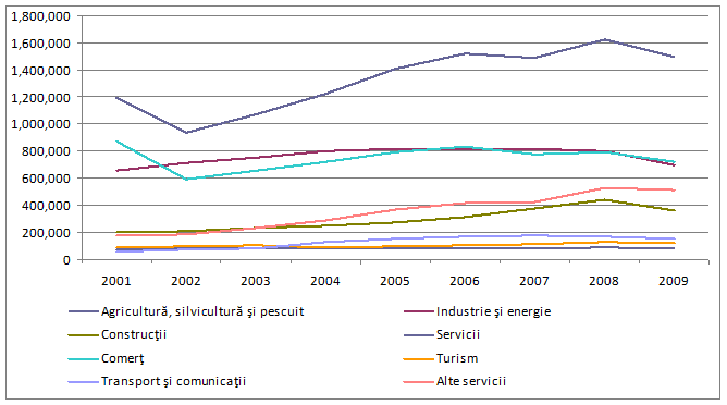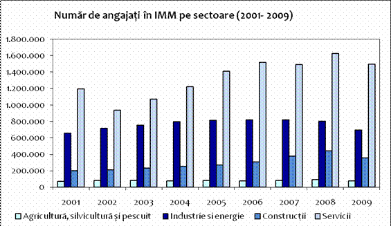 Astfel, este evident ca numarul de angajati in sectorul IMM industrial creste la inceputul intervalului, dupa care se pozitioneaza pe un plafon de stabilitate, in timp ce numarul de salariati in IMM din Servicii si Constructii isi continua evolutia ascendenta de-a lungul intregii perioade, dar cu accente mai puternice in ultimii doi ani. Toata aceasta dinamica pozitiva si accelerata este brusc intrerupta de evolutiile din anul 2009.