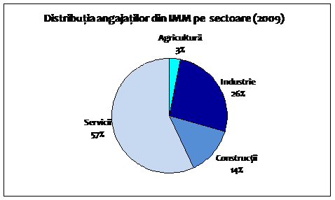 Astfel, structura pe sectoare principale de activitate ilustrata prin reprezentarea grafica de la 4.2.c. indica faptul ca sectorul Servicii furnizeaza mai mult de jumatate din numarul locurilor de munca ocupate cu personal salariat (57,0%), in timp ce ponderea numarului de angajati in IMM din Constructii scade de la 14,9% in anul 2008 la 13,5 %in 2009. In acest timp, ponderea persoanlului din IMM din agricultura se mentine constanta la 3,0%, in timp ce IMMurile din industrie pierd din importanta in crearea locurilor de munca. Totodata, diminuarea contributiei sectorului industrial in crearea de locuri de munca incepe cu mai multi ani inainte, respectiv din anul 2005, cand conform cu datele prezentate in tabelul nr.4.2.c. reprezenta 34% din numarul mediu anual al angajatilor din sector IMM iar pe fondul unor scaderi anuale atinge cea mai scazuta greutate specifica 26,5% in anul 2009.