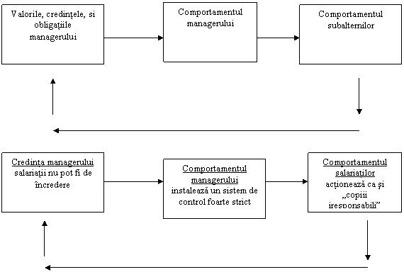 Intr-o anumita masura, credintele, valorile si atitudinile determina ambele fete ale comportamentului, bunavointa sau buna credinta si agresiunea superioara sau reaua credinta. Cunoscutul teoretician al managementului american, reprezentant de seama al scolii comportamentale, Douglas Mc Gregor ne-a lasat celebrul model de comportament managerial "Teoria X si Teoria Y". Potrivit acestui model, managerii caracterizati de "Teoria X" nu manifesta incredere in subalternii lor si sunt de parere ca salariatii nu vor sa munceasca cu responsabilitate si in consecinta trebuie supravegheati indeaproape. Acesti manageri stabilesc sisteme stranse de control pentru a se asigura ca salariatii lucreaza. Pe de alta parte, salariatii realizeaza ca managementul nu are incredere in ei, si drept raspuns incep sa devina deliberat recalcitranti, adica "iresponsabili". Managerul observand aceasta atitudine devine mai neincrezator si suspicios si va continua sa instaleze sisteme de control din ce in ce mai rigide (de multe ori chiar absurde). Potrivit lui Mc Gregor, credinta managerului ca salariatii nu pot fi intelesi si considerati de buna credinta, conduce la o atitudine iresponsabila a salariatilor, care in mod treptat intareste convingerea managerului ca salariatii nu pot fi de buna credinta; in acest fel, practic apare un cerc vicios (a se vedea figura de mai sus).
