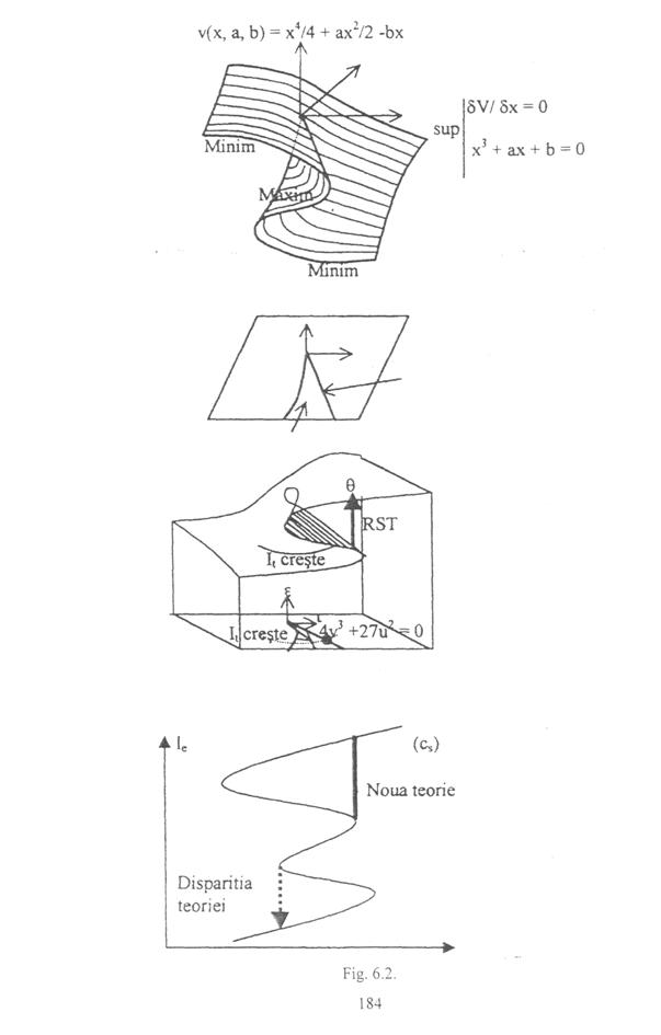 Cr ;Cc = cheltuieli pentru preluarea riscului (r) si pentru prevenirea catastrofei (c ); Vr = valoarea riscului (tehnologic - r ; economic - re; comercial - rc) si (Vc) pentru pagube produse de catastrofa, c = costul specific al preluarii perturbatiei; a, b = parametrii de control ai comportamentului; x = variabila de comportament; Est ;Eut = efortul (st) depus pentru realizarea stabilitatii si eficienta (ut) obtinuta. Catastrofele elementare pot fi de tip fold, coada de randunica, fluture, prastie, ombilic si cups.