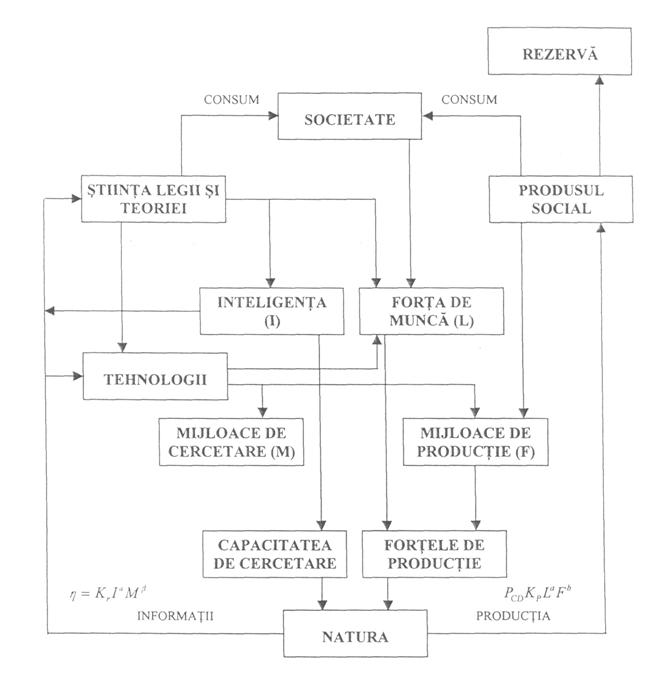 - Folosirea capacitatii de cercetare la investigarea naturii permite obtinerea informatiilor care, organizate in legi si teoreme creeaza stiinta. Stiinta este consumati pentru instruirea fortei de munca (L) si pentru modernizarea productiei (F). Corelarea fortelor de productie cu factorii care o constituie si aplicarea acestora asupra naturii ducea la crearea produsului social.
