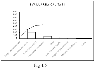 8. Analizarea diagramei. Cu o prima aproximare nu este greu sa se ajunga la concluzii valide despre cauzele principale ale reclamatiilor. In exemplu, putem observa ca aproape 2/3 dintre acestea (68%) se datoreaza la 2 categorii: timpul necesar Administratiei pentru a raspunde si "informatia transmisa ", fiind prima dintre acestea cea care a acumulat cele mai multe plangeri. Tinand cont ca este mai usor sa reduci o frecventa ridicata decat una joasa, se pare ca va fi mai util ca imbunatatirea sa se centreze pe primele 2 cauze (putine si vitale) decat pe cele care au incidenta mai mica (multe si triviale). Odata indeplinite actiunile oportune pentru reducerea acestor 2 motive, se poate elabora alta diagrama si verifica reducerea reclamatiilor la fiecare dintre categorii. Pe de alta parte, diagrama Pareto poate fi aplicata pentru a afla cauzele responsabile pentru categoriile considerate.
