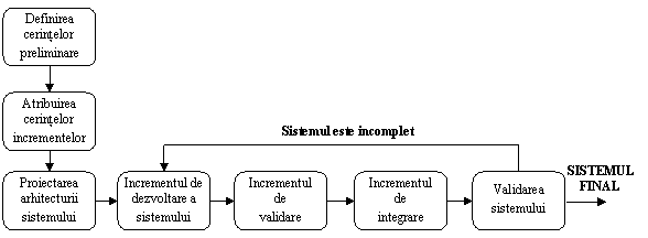 modelul de dezvoltare incrementala - in cadrul acestui model fazele de dezvoltare, proiectare si implementare se impart intr-un anumit numar de incremente care se desfasoara pe rand;