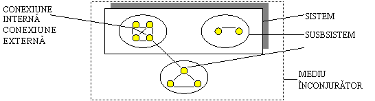 Un sistem este format din subsisteme, care la randul lor pot fi sisteme, si sunt formate din obiecte diferite, numite elemente avand o natura fizica diferita. Intre elementele unui sistem exista interactiuni sau conexiuni. Acestea se pot stabili si cu sisteme sau elemente din mediul inconjurator (Figura 1.1.).