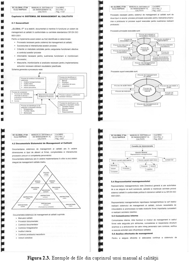 In figura 2.3 sunt prezentate ca exemple cateva file dintr-un manual al calitatii, pe care sunt vizibile o parte din caracteristicile descrise mai sus.