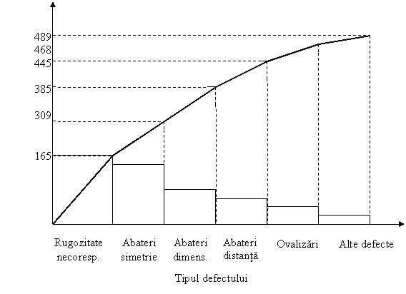 Diagrama Pareto (fig.5.5) ilustreaza grafic tipurile de defecte care au ponderea cea mai mare in totalul deficientelor de fabricatie