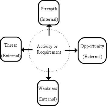 Figura2. Perceptia mediului intern si extern al unei intreprinderi/organizatii se refera la patru aspecte : i) Ce anume poate fi considerat punct forte (strength), care constituie un aspect intern (internal); ii) ce poate fi considerat un punct de slabiciune (Weakness), care constituie un aspect intern (internal) ; iii) ce anume se poate considera oportunitate (Opportunity), care constituie un aspect extern (external) ; iv) ce se poate considera amenintare (Threat), care constituie un aspect extern (external). Analiza SWOT este de obicei efectuata pentru identificarea contextului unei activitati sau cerinte (Activity or Requirement), cuprinse in obiectivul organizatiei.