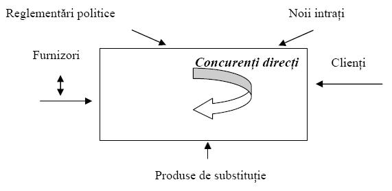 Michael E. Porter, profesor la Harvard Business School, a construit un model al competitiei economice intr-o industrie. In modelul Porter al celor "5 forte" pentru o societate comerciala, se pune un accent deosebit pe reliefarea amenintarilor pentru companie, ceea ce este normal, intrucat modelul dezvoltat de Michael E. Porter ghideaza analiza mediului competitiv al unei societati comerciale care opereaza intr-o anumita industrie. De fapt modelul 'celor cinci forte' instituie un cadru schematic general care descrie directiile pe care se desfasoara competitia economica intr-o industrie oarecare. Sa reamintim aici ca o industrie este constituita dintr-un grup de firme ale caror produse oferite pe piata dovedesc similaritate functionala (de exemplu industria automobilului).