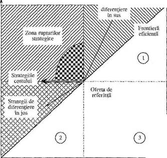 d) Zona "strategiilor diferentierii in sus '. Oferta sa se distinge de oferta de referinta mai ales prin valoarea superioara si pretul ridicat. Este esential ca, in conditiile costurilor echivalente, specificitatea ofertei diferentiate sa nu poata fi imitata de catre rivali.