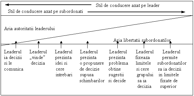 Experienta a demonstrat insa ca,de regula,un leader nu practica in exclusivitate un singur stil de conducere si ca nici un stil nu este potrivit pentru toate situatiile cu care se confrunta un conducator.In consecinta,cea mai realista abordare a stilului de conducere consta in considerarea acestuia ca fiind dependent de situatia in care se exercita,de personalitatea conducatorului si de capacitatea subordonatilor sai,ceea ce va determina acelasi leader sa utilizeze diferite stiluri de conducere.Aceasta abordare,datorita lui R.Tannenbaum si W.Schmidt,este cunoscuta sub numele de cea a "stilului continuu de conducere",in sensul ca sustine existenta intre cele doua extreme-autocratic si democratic-a unei varietati de stiluri in functie de libertatea acordata subordonatilor,potrivit schemei urmatoare :