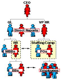 Maestrii centurilor negre (MBB) numesc centurile negre (BB) si centurile verzi (GB) si lucreaza impreuna cu acestia si proprietarii procesului pentru finalizarea proiectelor si pentru imbunatatirea calitatii proceselor organizatiei.