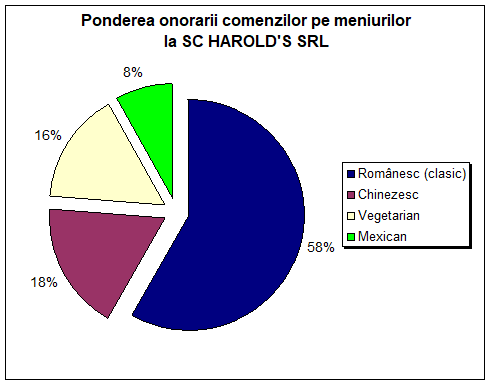 Ponderea cea mai mare a comenzilor la SC HAROLD'S o are meniul romanesc si anume cu 58%, comparativ cu meniul chinezesc (18%), vegetarian (16%) si mexican (8%).