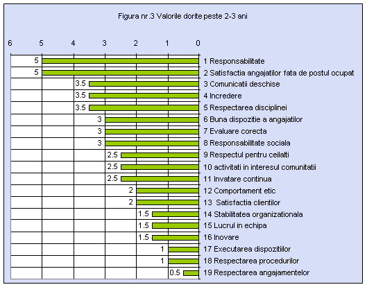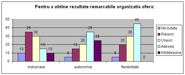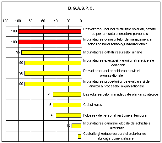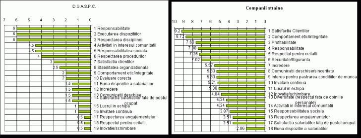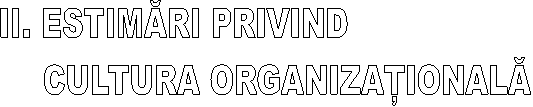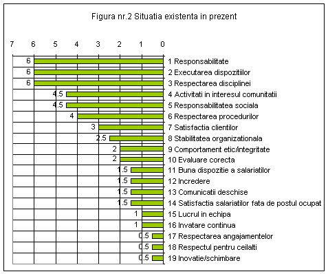 Din reprezentarea grafica rezulta ca orientarea culturii organizationale in cadrul D.G.A.S.P.C. prezinta un spirit autoritar , in care comportamentul etic si stimularea lucrului in echipa apare intr-un plan secundar . Observam ca valori ca :