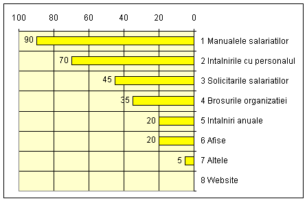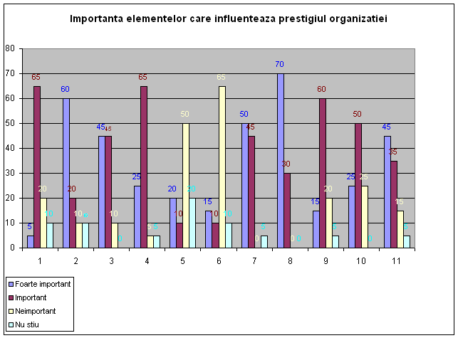 Statistica realizata ca urmare a interpretarii chestionarelor aplicate, evidentiaza faptul ca toate elementele care influenteaza prestigiul organizatiei au un impact important spre foarte important. Singurele aspecte neimportante sunt cele prezentate la punctele 5 si 6, respectiv dialogul cu actionarii si impactul activitatii organizatiei asupra protejarii mediului, deoarece nu au relevanta la nivelul institutiei pentru care s-a efectuat studiul.