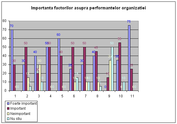 Respondentii au caracterizat ca fiind de o importanta majora toti factorii prezentati ca avand o influienta asupra performantelor viitoare ale organizatiei, cu exceptia "succesului in comertul electronic", care nu are relevanta in cazul institutiei studiate.