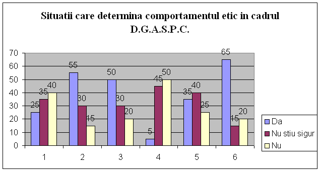 Putem concluziona in urma studiului intreprins ca la nivelul D.G.A.S.P.C. se manifesta o orientare spre un climat autoritar, o vaga definire a valorilor, normelor precum si lipsa/neaplicarea unui cod etic. Intr-o institutie, corectitudinea este unul din elementele definitorii pentru succes. Datoria fiecarei institutii este de a dezvolta la proprii angajati un comportament etic. Codurile de etica se adreseaza atit personalului propriu, ele servind in procesul de incadrare pe functii, promovare si salarizare cit si partenerilor sociali.