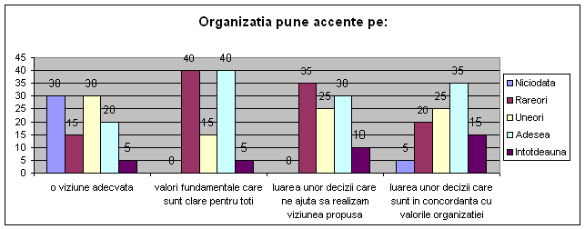 Abaterea de la valorile organizatiei este situata in prima jumatate si putem remara ca aceasta este realizata printr-un control periodic al modului cum sint realizate actiunile din planul de implementare si evaluarea periodica a rezultatelor acestor actiuni sint indispensabile