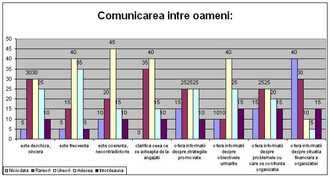 De asemenea un rol foarte important pentru performantele organizatiei, detine abilitatea de a comunica, in acest caz putand vorbi de 3 tipuri de comunicare: comunicarea pe verticala - dintre manageri si angajati, comunicarea pe orizontala - dintre angajati si comunicarea dintre angajatii institutiei si persoanele carora se adreseaza serviciile oferite de aceasta precum si cu celelalte institutii cu care colaboreaza.