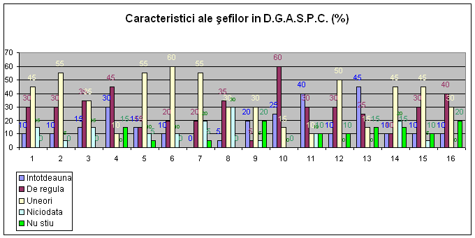 Dupa o analiza atenta a rezultatelor obtinute in urma interpretarii chestionarelor, in ceea ce privesc caracteristicile sefilor in organizatie, putem afirma ca raspunsurile se contrazic oarecum, in sensul ca: la punctele 1,2,3,5,6,7,9,12,14,15 raspunsul dominant este uneori , iar la punctele 4, 8, 10, 16, raspunsul dominat este de regula . Singurele caracteristici la care raspunsul majoritar este intotdeauna sunt integritatea morala si loialitatea fata de interesele institutiei.