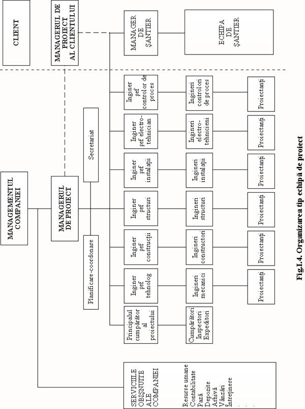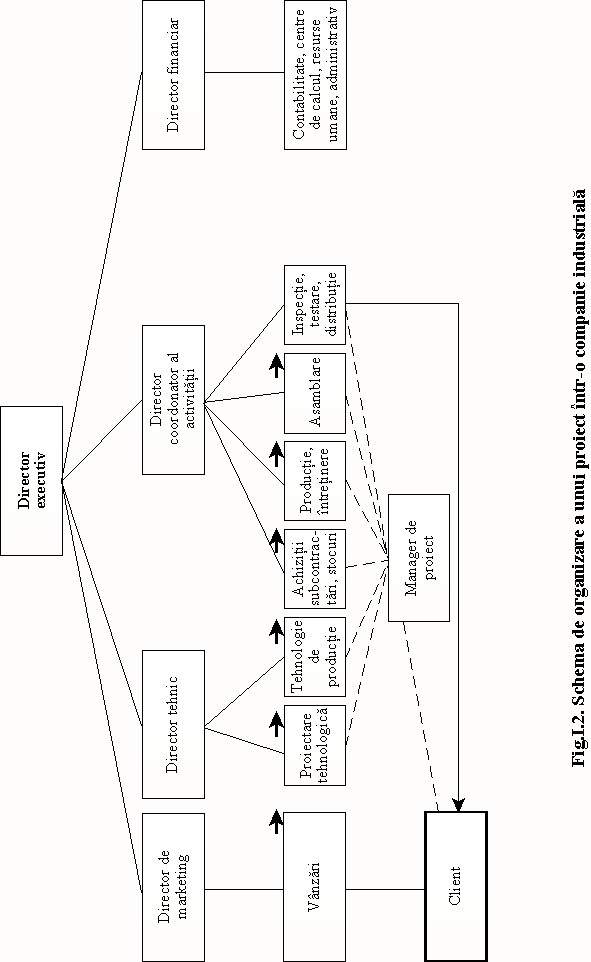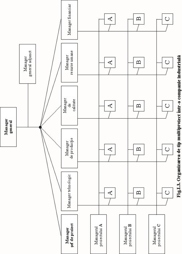Majoritatea informatiilor legate de proiect circula de-a lungul liniilor ierarhice dar si intre acestea, formand o retea complexa. Cineva trebuie sa raspunda de gestionarea proiectului in ansamblu, fara a risipi raspunderea intre mai multi manageri. Este deci nevoie de o persoana care sa planifice si sa coordoneze cu grija toate activitatile proiectului cu scopul clar de atingere a obiectivelor acestuia. Persoana este managerul de proiect. Fig.I.2 arata modul de implicare a managerului de proiect la realizarea unui proiect special si fig.I.3 arata o situatie mai complexa in care firma deruleaza mai multe proiecte complexe in paralel, cu mai multi manageri de proiect. Pozitia ierarhica a managerului/managerilor de proiect rezulta chiar din fig.I.2 si I.3.