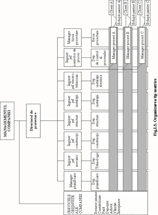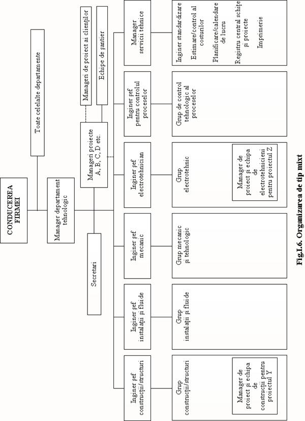 O a treia solutie de organizare este optiunea mixta - fig.I.6. Varianta optiunii mixte se intalneste la firmele care functioneaza in regim matricial, dar infiinteaza grupe de proiect separate si autonome ori de cate ori marimea si domeniul proiectului o justifica.