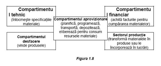 Desfasurarea in bune conditii a activitatii de aprovizionare in concordanta cu cerintele de consum ale unitatii economice, cu necesitatea realizarii contractelor incheiate cu clientii, cu furnizorii de materiale, impune organizarea unui sistem complex de relatii atat in interiorul fiecarei intreprinderi, cat si in afara acesteia. Pe plan intern, relatiile se organizeaza intre compartimentul de aprovizionare materiala si celelalte compartimente sau subunitati din cadrul structurii organizatorice a unitatilor de productie. In acest context general, conducerea aprovizionarii materiale, de exemplu, are misiunea importanta de a tine permanent active raporturile cu sectorul tehnic care emite specificatiile materiale, cu sectorul de productie care transforma resursele materiale in produse sau le incorporeaza in lucrari, cu compartimentul financiar care achita facturile pentru materialele aprovizionate, cu compartimentul desfacere care vinde produsele (figura 1.8)
