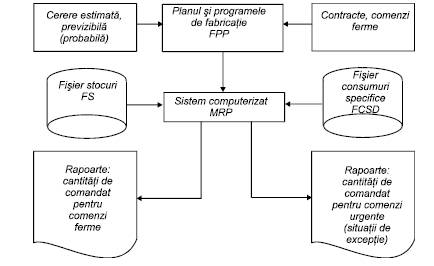 Sistemul MRP este descris de Jack Meredith in lucrarea 'The management operations'1. Semnificativ este faptul ca in planificarea cererilor de materiale este necesar un volum mare de informatii referitoare la activitatea de productie, de stabilire a consumurilor specifice (a normelor de consum) pe baza de documentatie tehnico-economica, de dimensionare a stocurilor pe criterii economice, de elaborare a programelor de recuperare a resurselor interne reutilizabile s.a. Componentele si fluxurile de informatii necesare planificarii cererilor de materiale, dupa sistemul MRP, se prezinta schematic in figura 4.1.